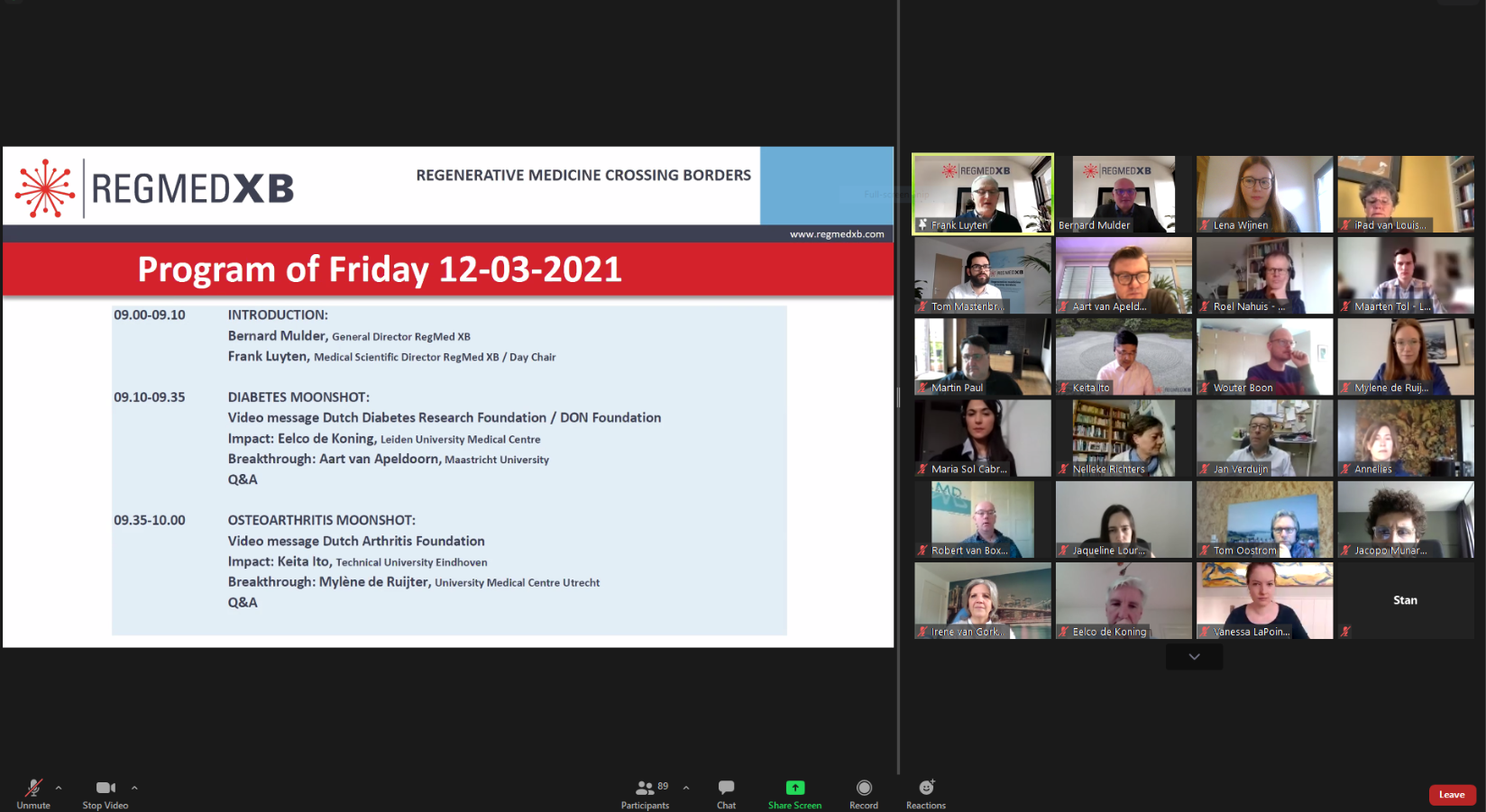 Last Thursday 11 and Friday 12 March 2021, RegMed XB’s first online Townhall Event took place instead of the planned Annual Meeting. A diverse and interesting program was offered over these two days, ranging from showcasing the scientific progress in the RegMed XB Moonshots, the abilities of industrial partners to very relevant hot topic sessions.